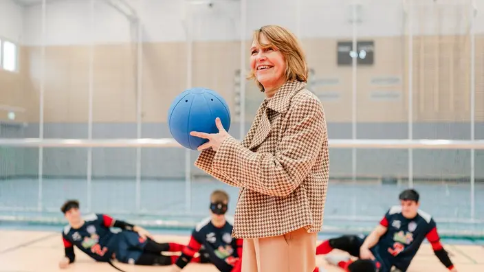 Im Anschluss besuchte die First Lady die 2024 neu eröffnete Sport- und Veranstaltungshalle, in der sie miterlebte, wie Inklusion im Sport ganz praktisch gelebt wird. Eine Trainingseinheit der Goalball‑Gruppe bot spannende Einblicke in diese inklusive Sportart für sehbehinderte und blinde Menschen. Mario Turloff, Sportvorstand des Rostocker Goalball Clubs, erklärte die Regeln und Besonderheiten des Spiels und zeigte auf, welchen wichtigen Beitrag Goalball für gemeinsames Sporttreiben und gegenseitiges Verständnis leistet.