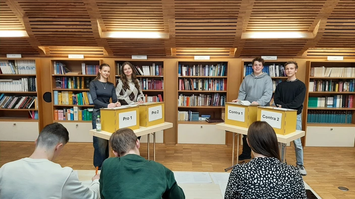 Heute fand in der Schulbibliothek der Wettbewerb „Jugend debattiert“ statt, bei dem acht Schüler/innen aus den Klassenstufen 8 bis 12 ihr Können unter Beweis stellten. Im Mittelpunkt standen spannende und anspruchsvolle Fragestellungen, die zu fairen, sachlichen und lebhaften Diskussionen anregten: